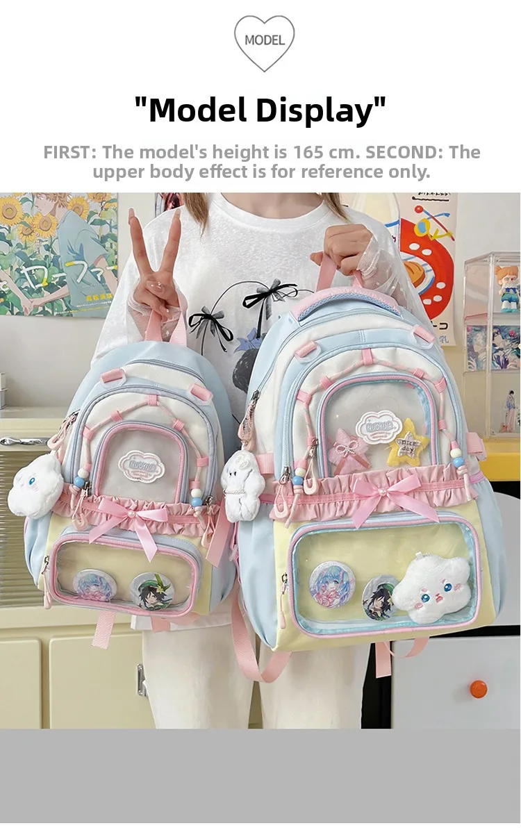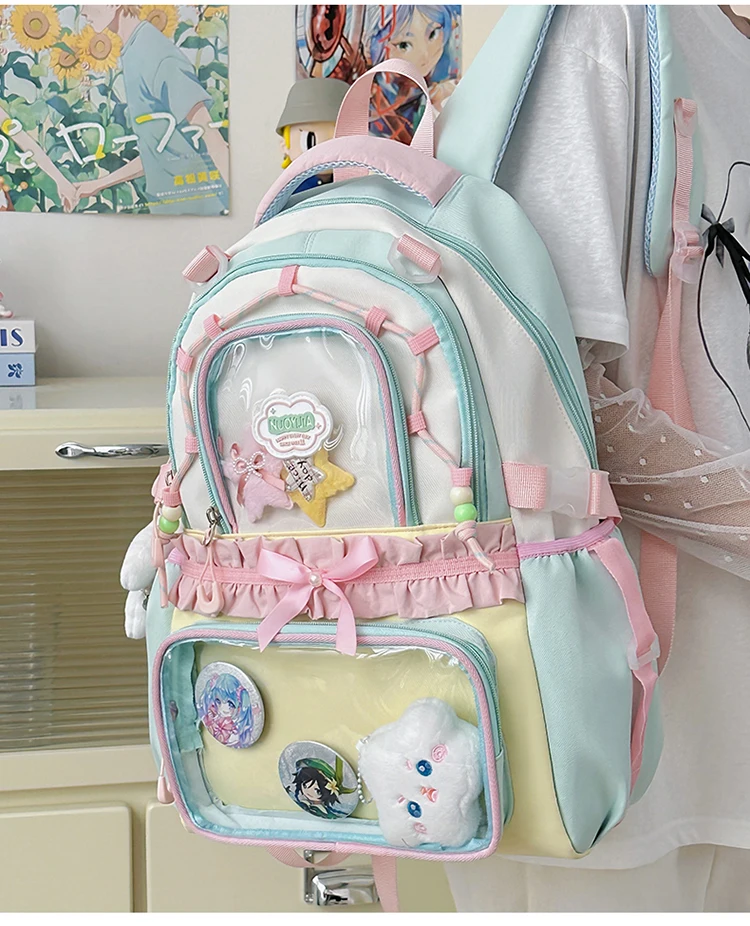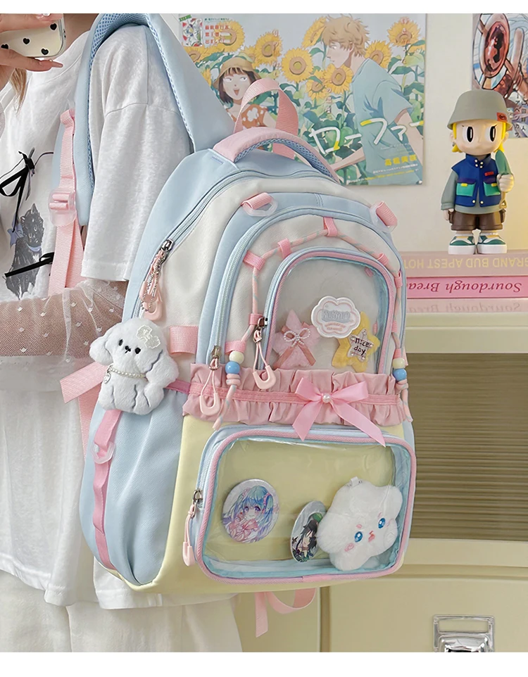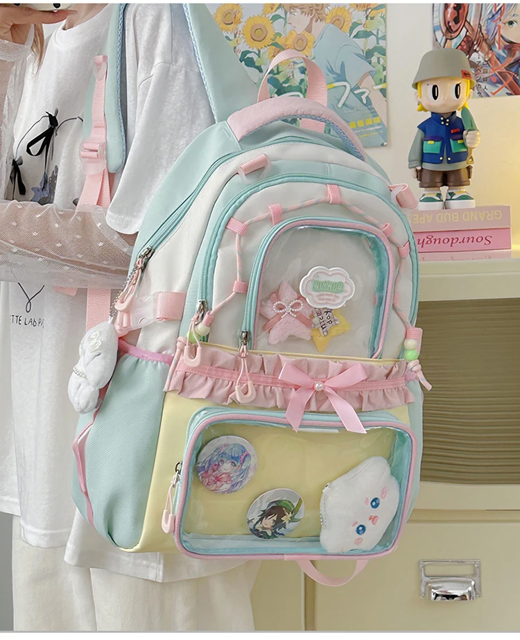 O estilo escolar e delicado desta mochila adiciona um toque de fofura ao seu visual, tornando-a uma das favoritas entre os estudantes.